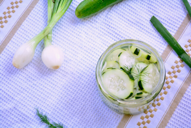 This classic cucumber salad is no stranger to most people. Â I have yet to meet someone who doesn’t know what it is, although the variations on making it are as controversial as how to eat a peanut-butter cup. Â This salad was a weekly visitor to my family’s Sunday dinner spread growing up, and in the summer it is my saving grace. Â Tangy, a bit sweet, with a touch of dill, Â it always satisfies a snack craving and can be pulled out of the fridge for a nice side-dish to any meal.
