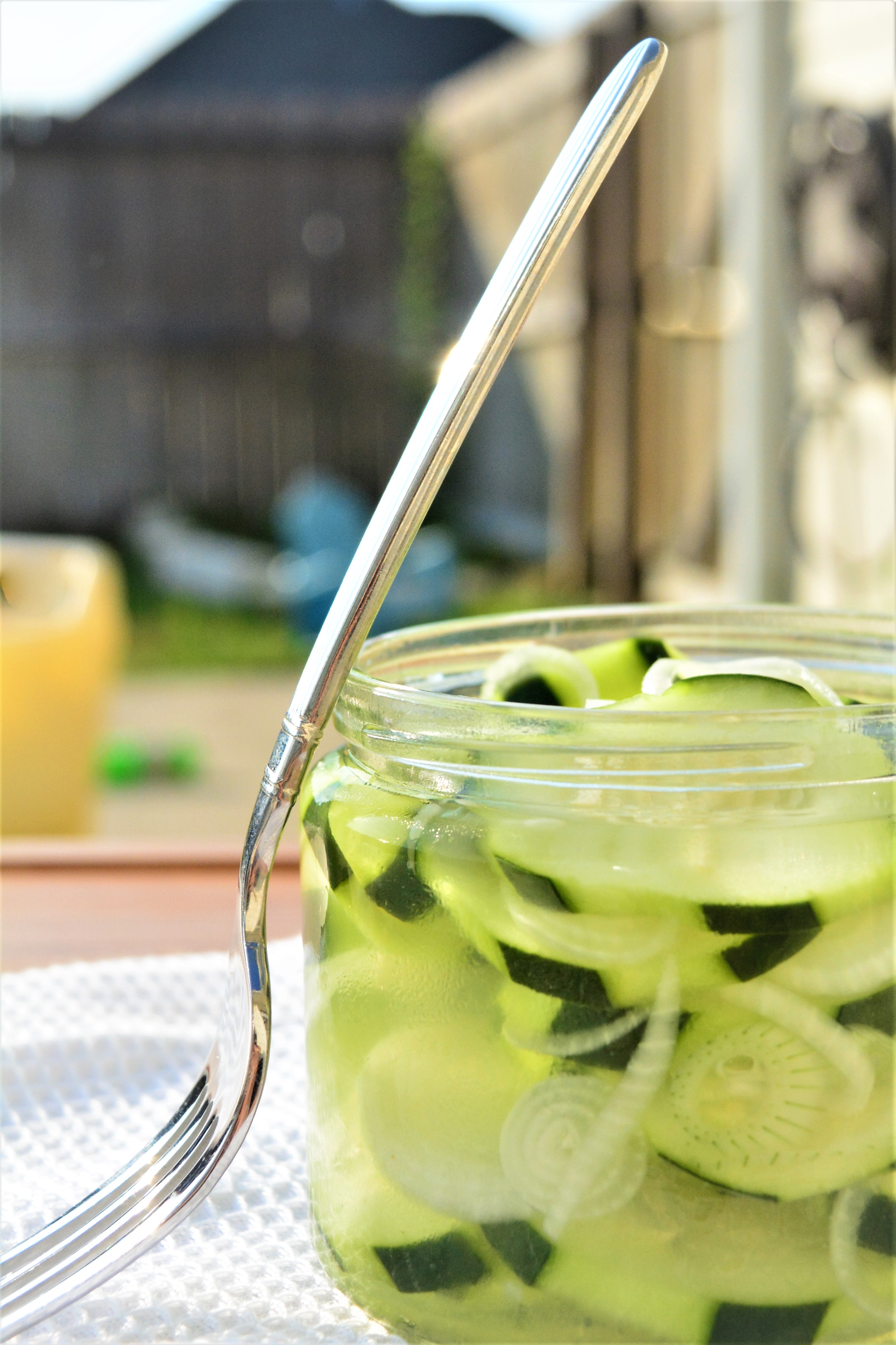 - Pour vinegar mixture (while hot) over cucumbers and mix well. Allow to sit for at least 30 minutes before eating. Can keep in fridge for 3-5 days.