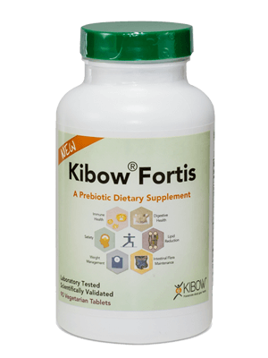 Kibow Fortis™ has 4 gm of fiber per 3 capsules or 1 scoop of powder. A good way to slowly increase fiber in your diet would be to start with 4 grams of fiber (1 scoop or 3 capsules) for about 3-5 days. If you don’t notice any gas or bloating, then increase it by another 4 grams for a few days and again monitor how you feel. If you feel fine then increase it by another 4 grams for a total dosage of 8-12 gms/day. If you choose to use a different prebiotic, again the most important thing is to work up to an 8-12 gram dose SLOWLY over a couple of weeks.