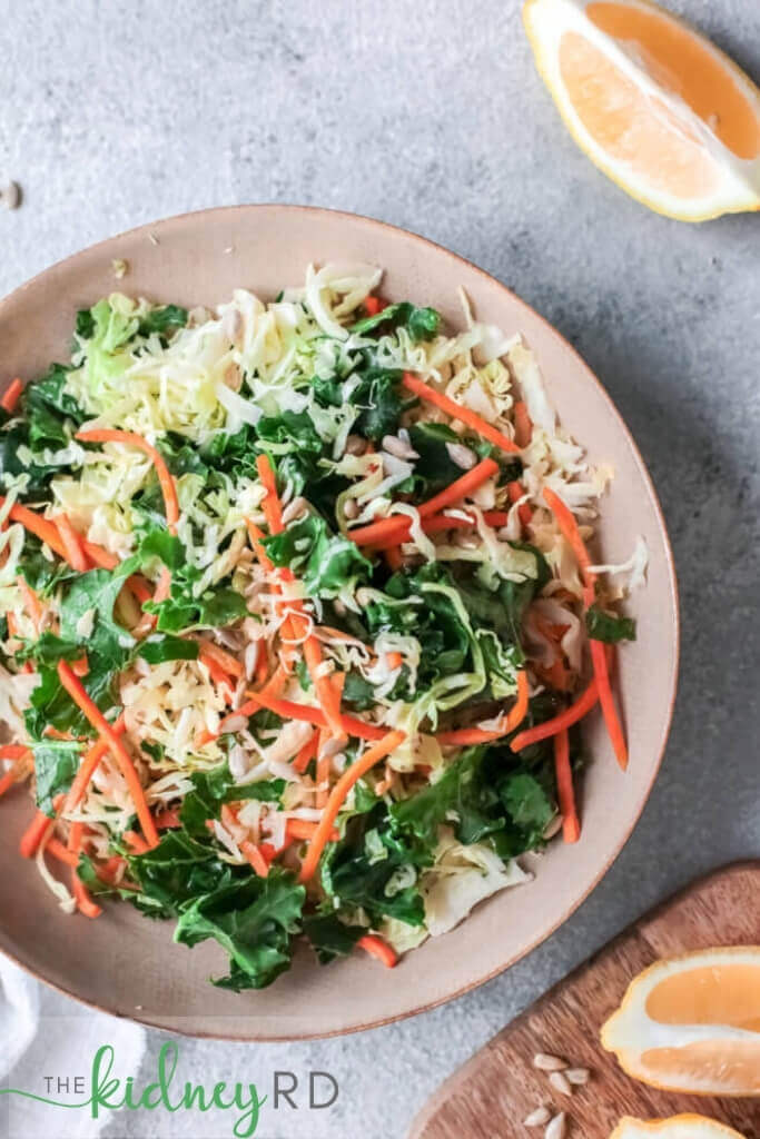 - Using a large bowl, mix the dressing, cabbage, and kale together. Divide between 4 plates or storage containers. Top each with 2 tablespoons sunflower seeds and 1/2 tablespoon hemp hearts.
